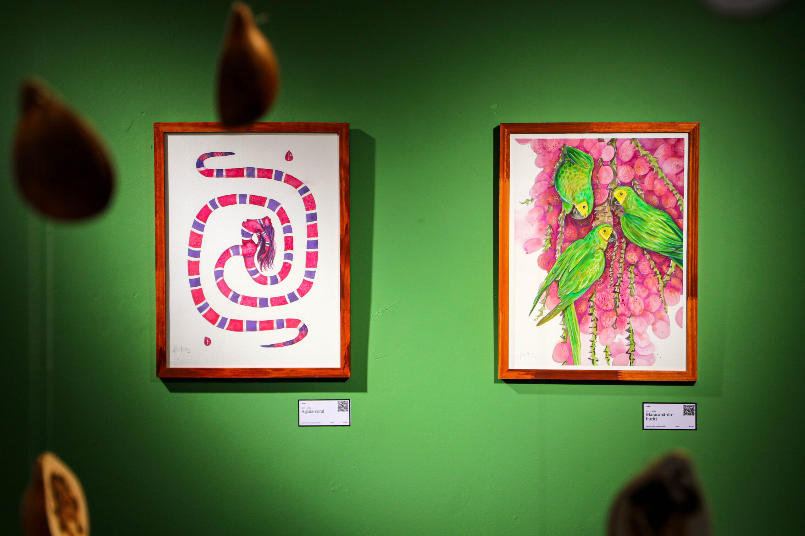 Obras em aquarela retratam elementos da fauna e da cultura tocantinense com cores vibrantes e riqueza de detalhes - Foto Flavia Ruth