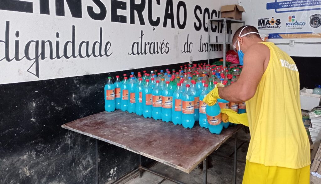 Custodiados da Unidade Penal de Dianópolis (UP), administrada pela Secretaria do Estado de Cidadania e Justiça (Seciju), estão há mais de um mês produzindo sabão líquido e desinfetante artesanais que serão utilizados dentro da própria unidade penal.
